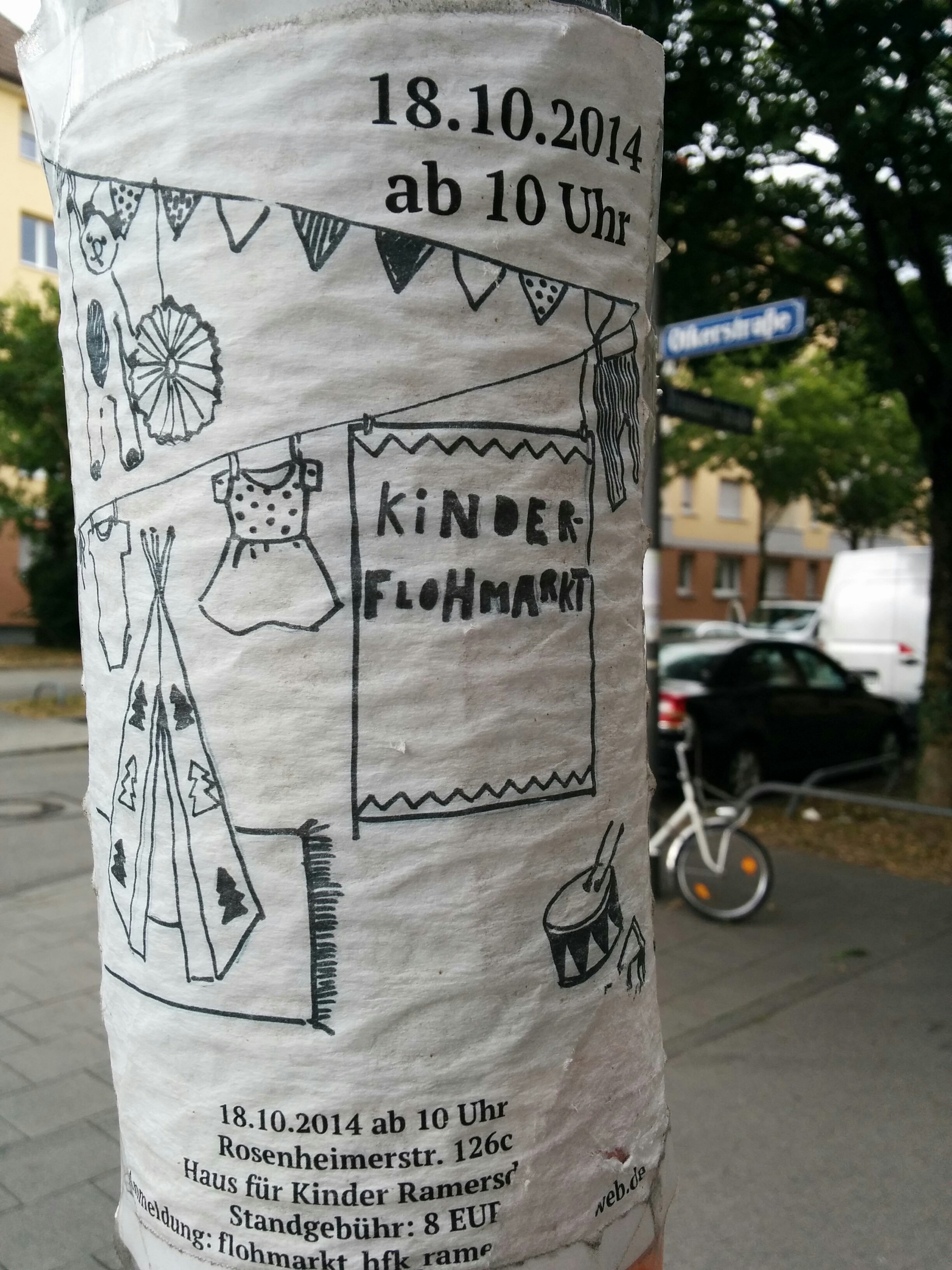 IMG_20150725_181543Als ich schwanger war, hingen gefühlt an jedem Ampelmasten in meinem Viertel die Ankündigungen für Baby-/Kinderflohmärkte in Gemeindezentren, Turnhallen oder Kindergärten. Als ich jetzt so einen Zettel fotografieren wollte, musste ich richtig suchen und fand prompt nur diesen abgelaufenen 😉
