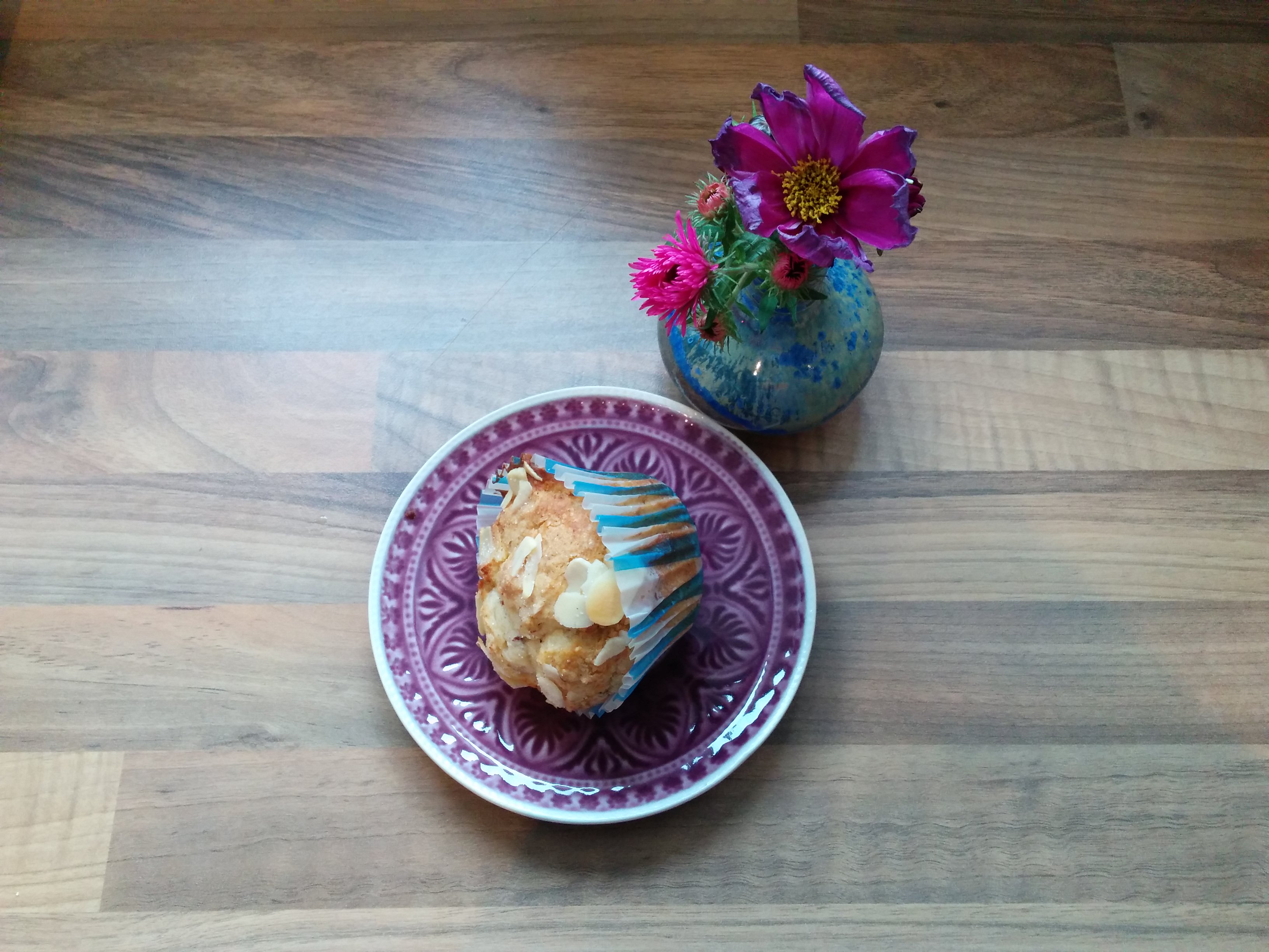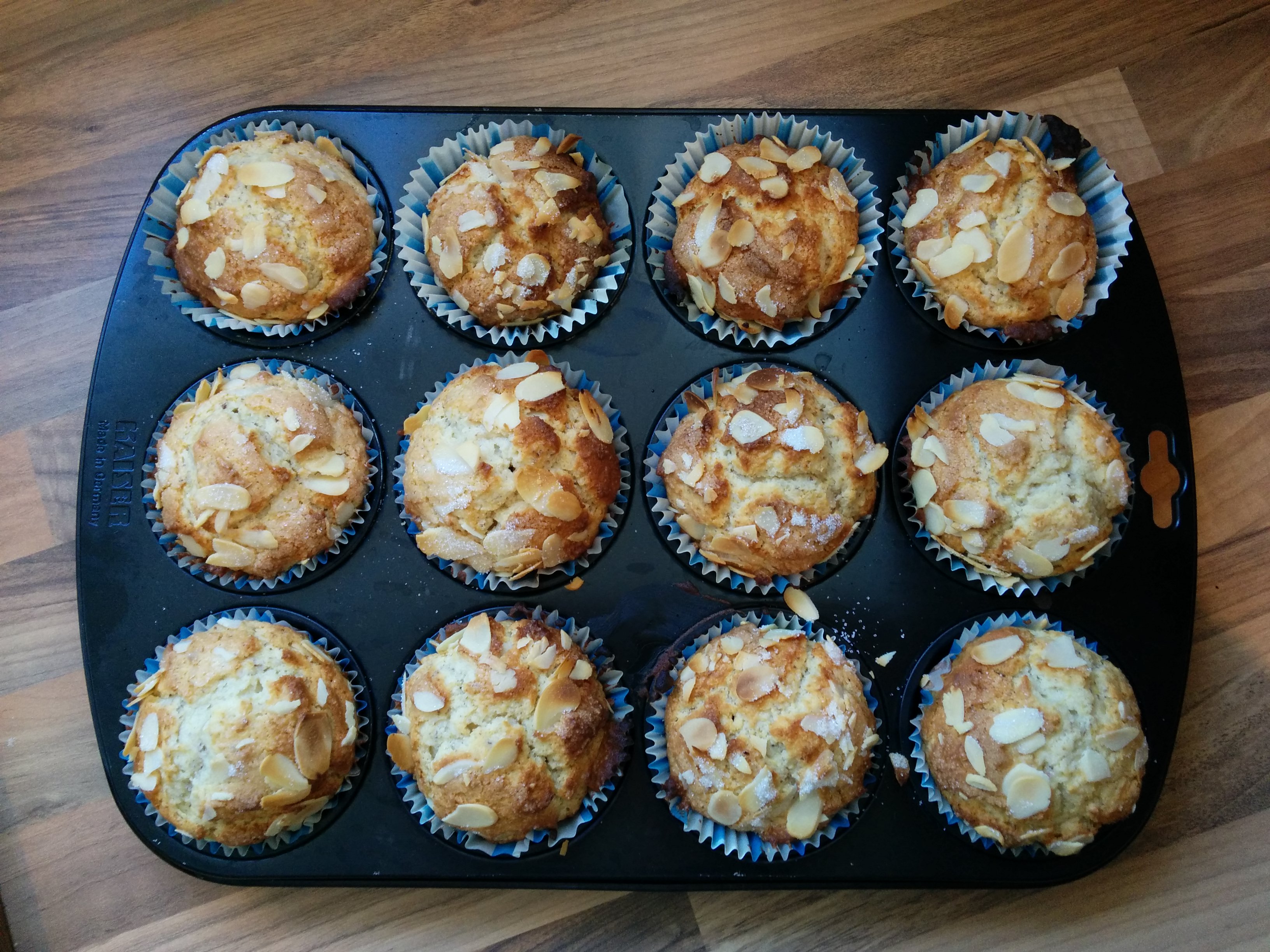 Den Teig in die mit Papierförmchen ausgelegten Muffinformen füllen und anschließend jeweils mit Mandelblättchen und einer Prise Zucker bestreuen. Nun werden die Muffins etwa 20 Minuten auf der mittleren Schiene des Ofens gebacken, bis sie eine leicht goldene Farbe angenommen haben. Am besten schmecken sie noch leicht warm!
