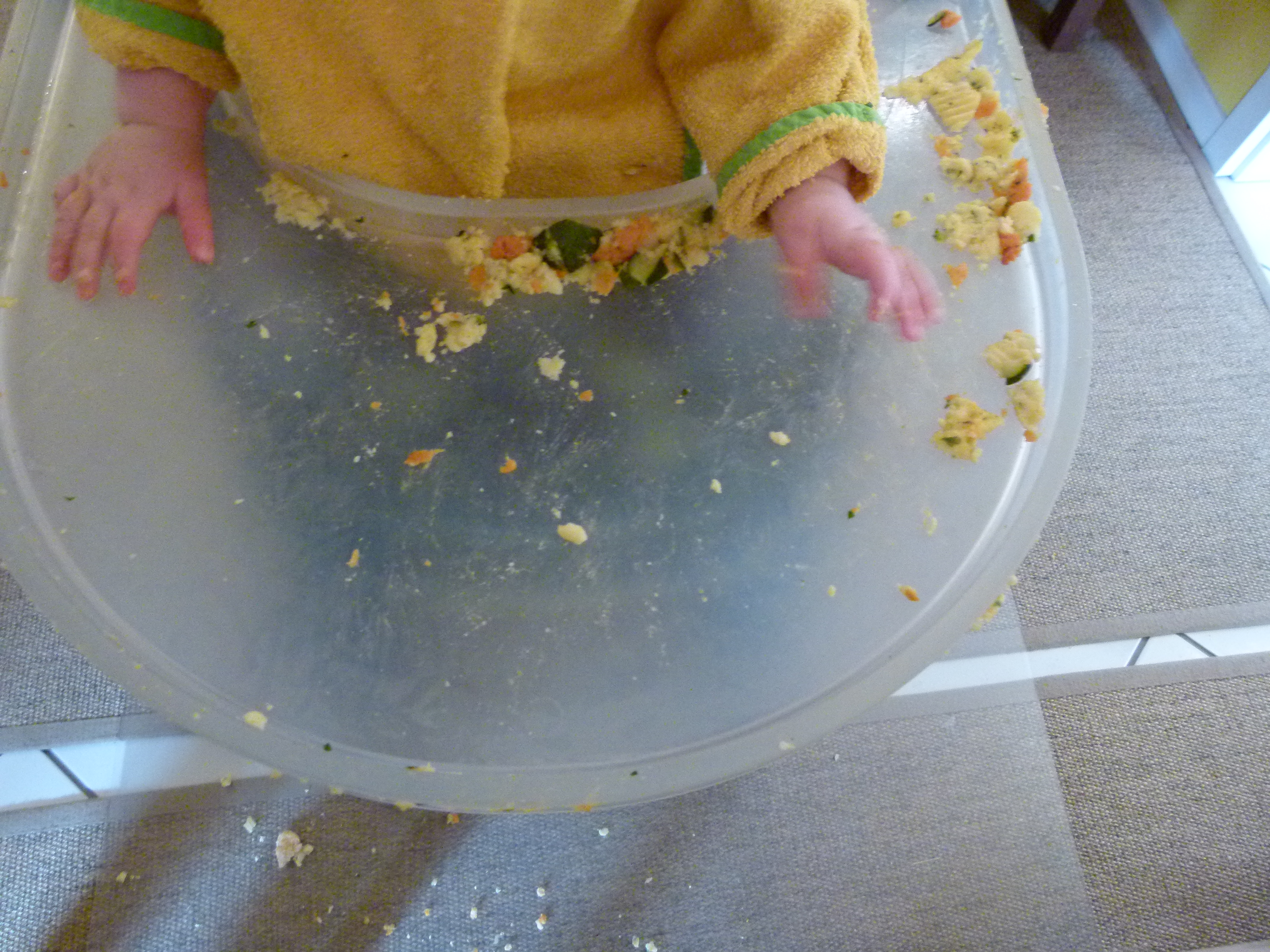 In den ersten mindestens 6-8 Wochen gab es recht häufig Mahlzeiten, bei denen der kleine Kuckuck nach spätestens 5 Minuten nicht mehr in seinem Stühlchen sein wollte, das Essen kaum angerührt (oder nur auf den Boden geworfen) hat und das alles recht überflüssig fand. Auf meinem Schoß war es auch nicht viel besser, nur die Sauerei war da noch viel größer. Ich habe dem geduldig nachgegeben (sehr entgegen meinem eigentlichen Naturell 😉 ) und nicht groß versucht, ihn zu überreden. Aber mit der Zeit ist doch von selbst sein Interesse erwacht. Erst gab es bestimmte Lieblings-Lebensmittel, wie zum Beispiel Banane oder Nudeln (beides nach wie vor unter den Top 5). Und mittlerweile, das ging irgendwie schleichend, wird fast alles zumindest gründlich untersucht und mal probeweise angeknabbert. Bei Dingen, die er kennt und mag, haut er auch schonmal richtig rein, andere Lebensmittel hingegen ignoriert er recht konsequent (Möhre? Was soll das?!). Weiterhin gibt es aber Tage, und zwar nicht wenige, an denen er einfach nicht wirklich essen möchte, weil er zum Beispiel erkältet ist, zahnt, oder aus Gründen, die er mir nicht nennen mag. Nach wie vor landet auch sehr viel Essen auf dem Boden, dem Lätzchen, hinter Ohren (seinen und meinen), in Haaren (seinen und meinen) und in der Nachbarschaft im Umkreis von etwa 5 Kilometern… Ich sehe das gelassen, denn wir stillen nach wie vor nach Bedarf, so dass er seine Nährstoffe bekommt, auch wenn er mal nichts Festes essen möchte.